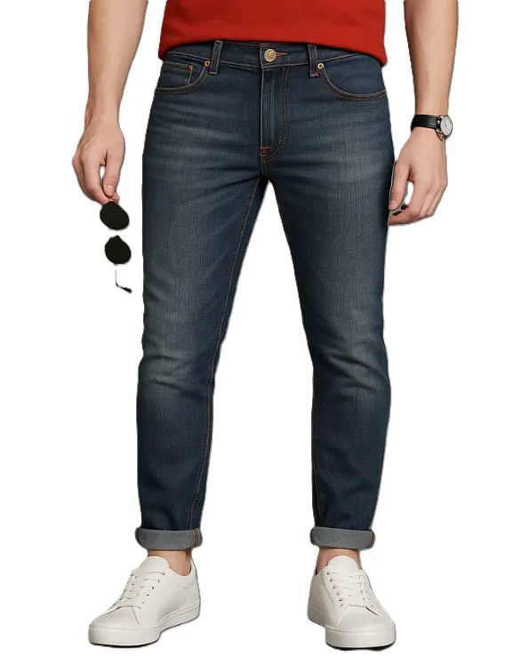 Regular Fit Blue Jeans, crafted from high-quality denim for lasting comfort and style. These versatile jeans feature a classic blue hue that pairs effortlessly with any top, including a vibrant red shirt for a striking look. Designed for a relaxed fit.