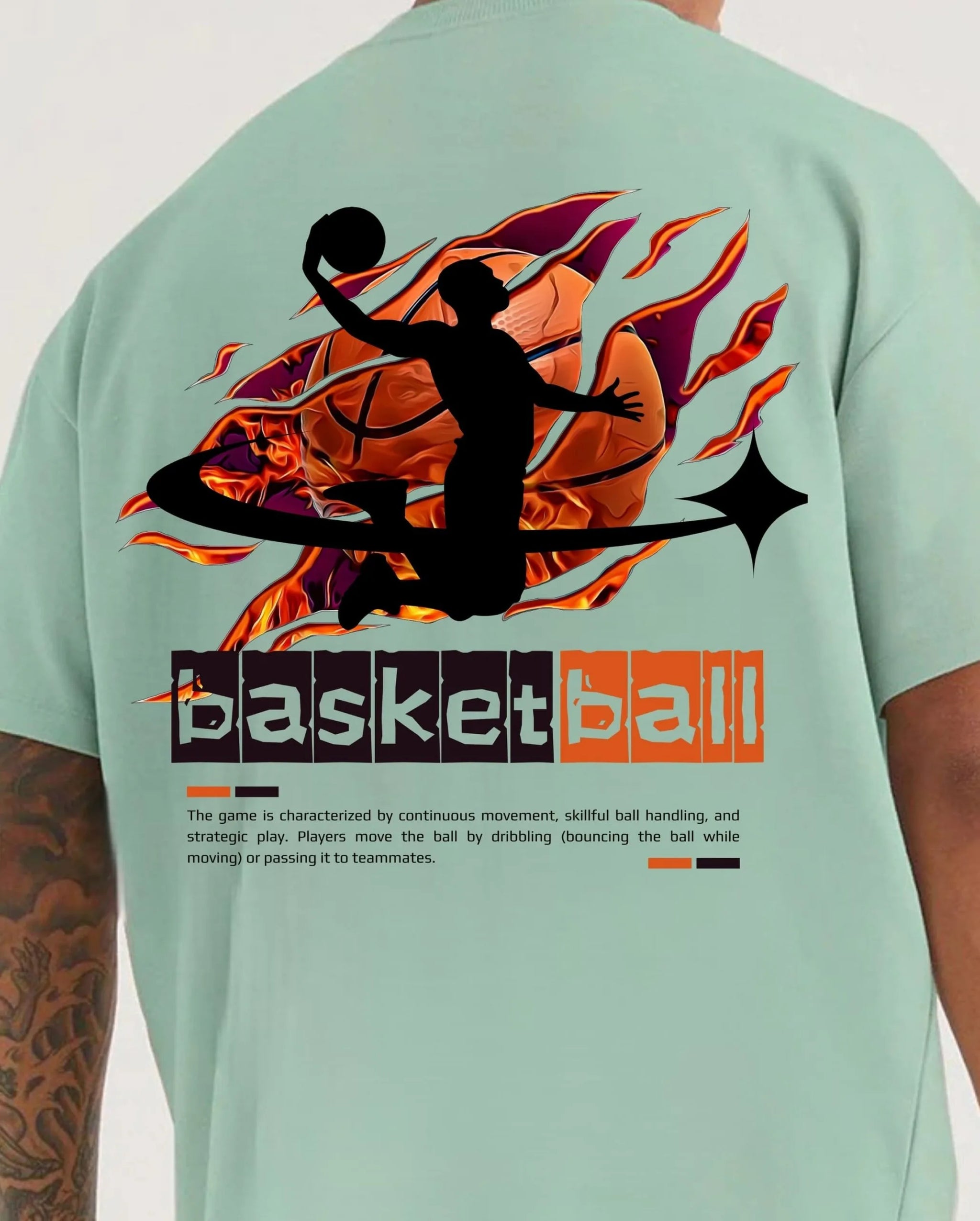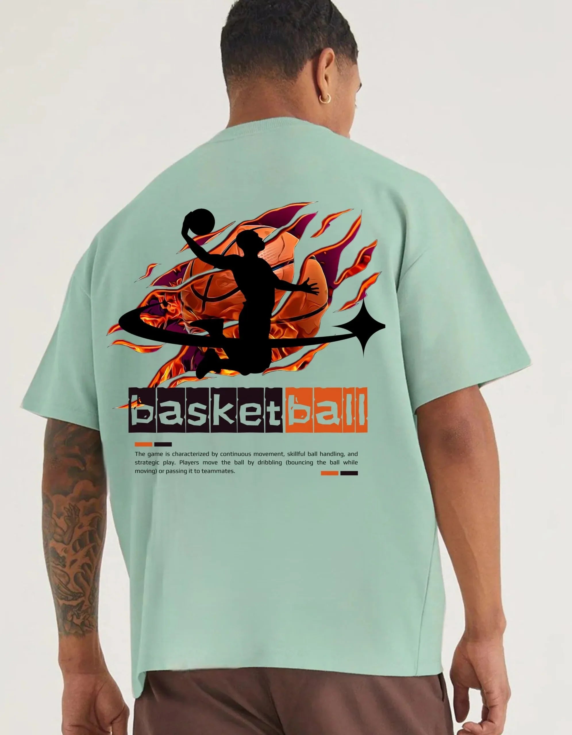 Sporty Oversized T-Shirt in a refreshing mint green hue, featuring a dynamic basketball ball graphic. This stylish tee combines comfort and trend, making it perfect for both on and off the court