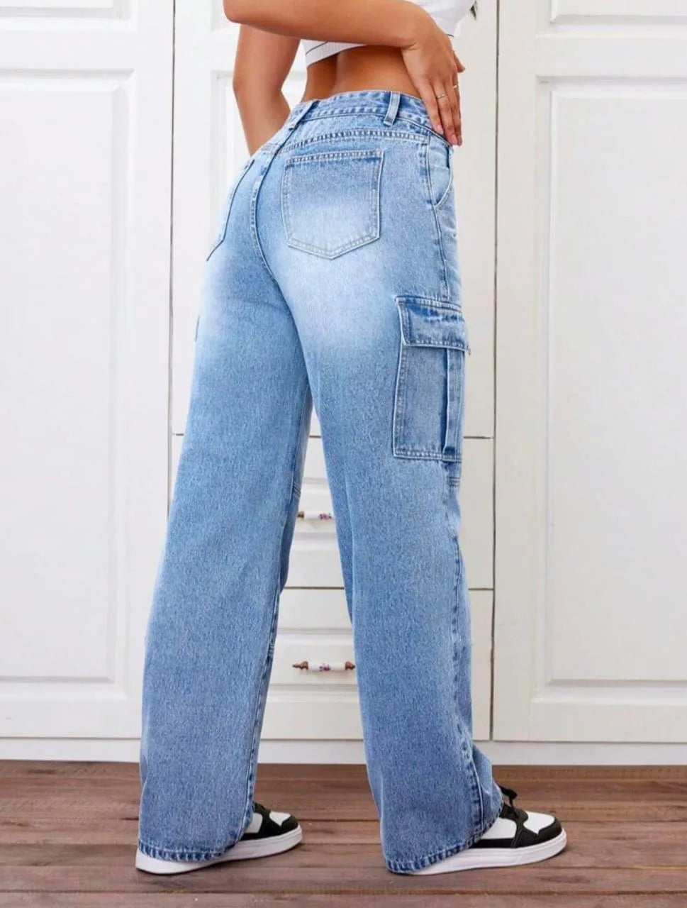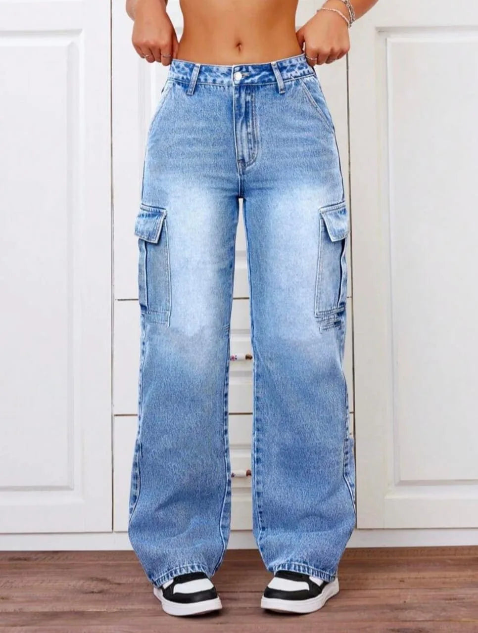 The perfect blend of style and comfort with our Whisker Wash Cargo jeans. Designed for the modern woman, these blue jeans feature a flattering fit that pairs effortlessly with any white top, making them a versatile addition to your wardrobe.